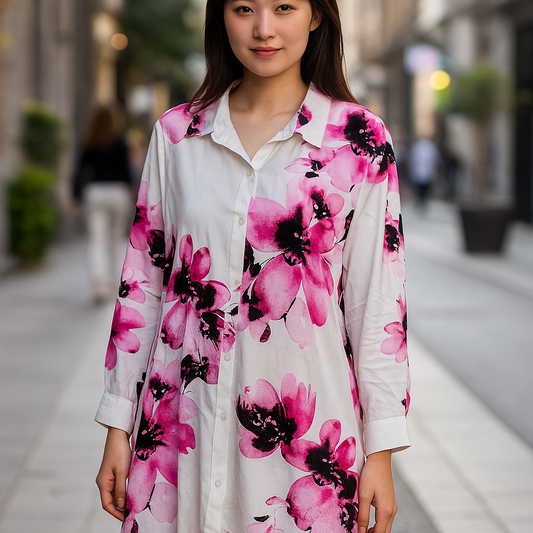 Embrace a fresh and breezy style with this botanical print shirt dress, crafted from a lightweight and breathable blend of 80% viscose and 20% linen. Featuring a striking all-over floral and leaf pattern, this dress combines comfort with eye-catch... read more