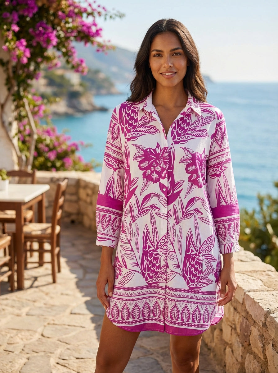 Embrace a fresh and breezy style with this Botanical Print Linen Blend Shirt Dress, crafted from a lightweight and breathable linen blend material. Featuring a striking all-over floral and leaf pattern, this dress combines comfort with eye-catching design, perfect for casual outings or vacations. Key Features Bright botanical inspired print A lightweight, breathable linen blend material Perfec... read more