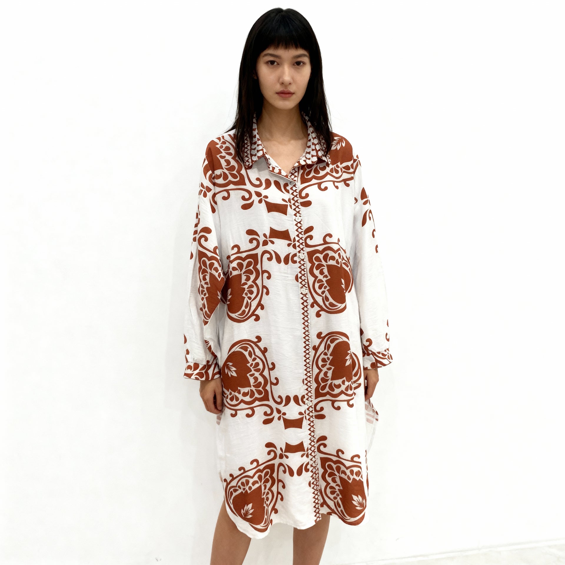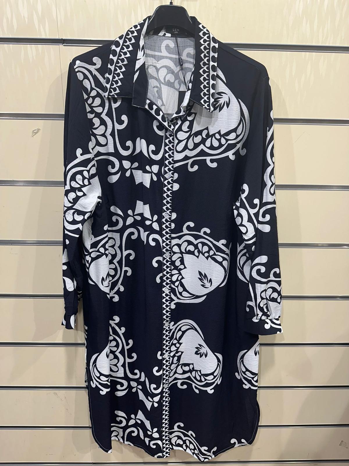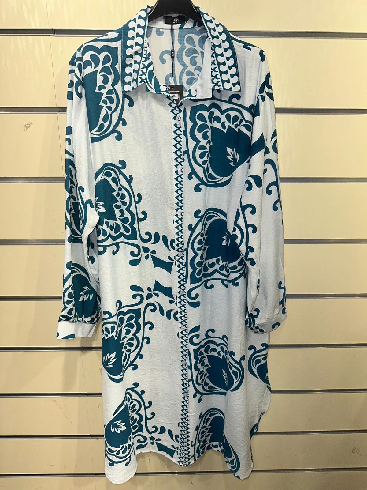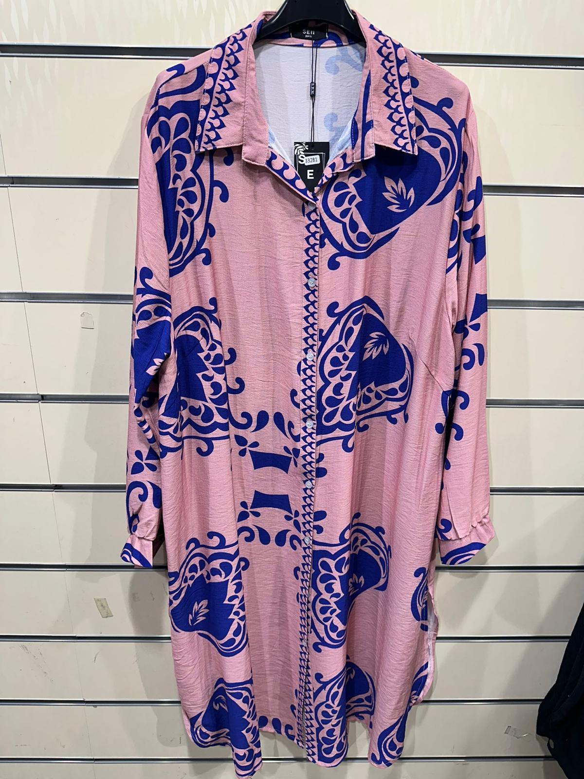 Experience effortless style with this oversized shirt dress, crafted from a soft and comfortable blend of 95% polyester and 5% elasthanne for a relaxed fit and easy movement. Featuring a unique geometric and floral print pattern, this piece is available in a range of colors including white, beige, black, red, gray, pink, green, and orange. The design includes button front closure, dropped shoulders, and a classic collar, making it versatile for casual outings or layered looks. Choose your favorite from our selection of vibrant and neutral shades to match your mood and wardrobe needs.