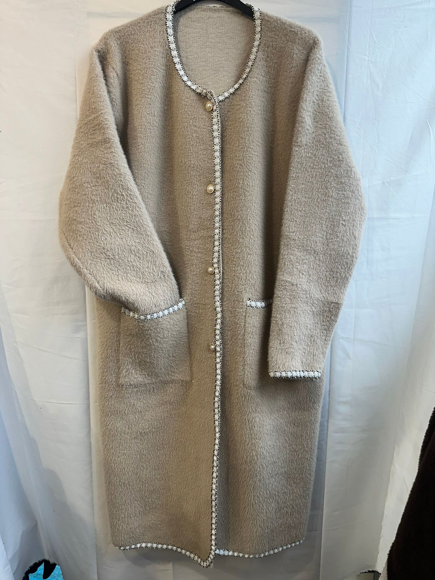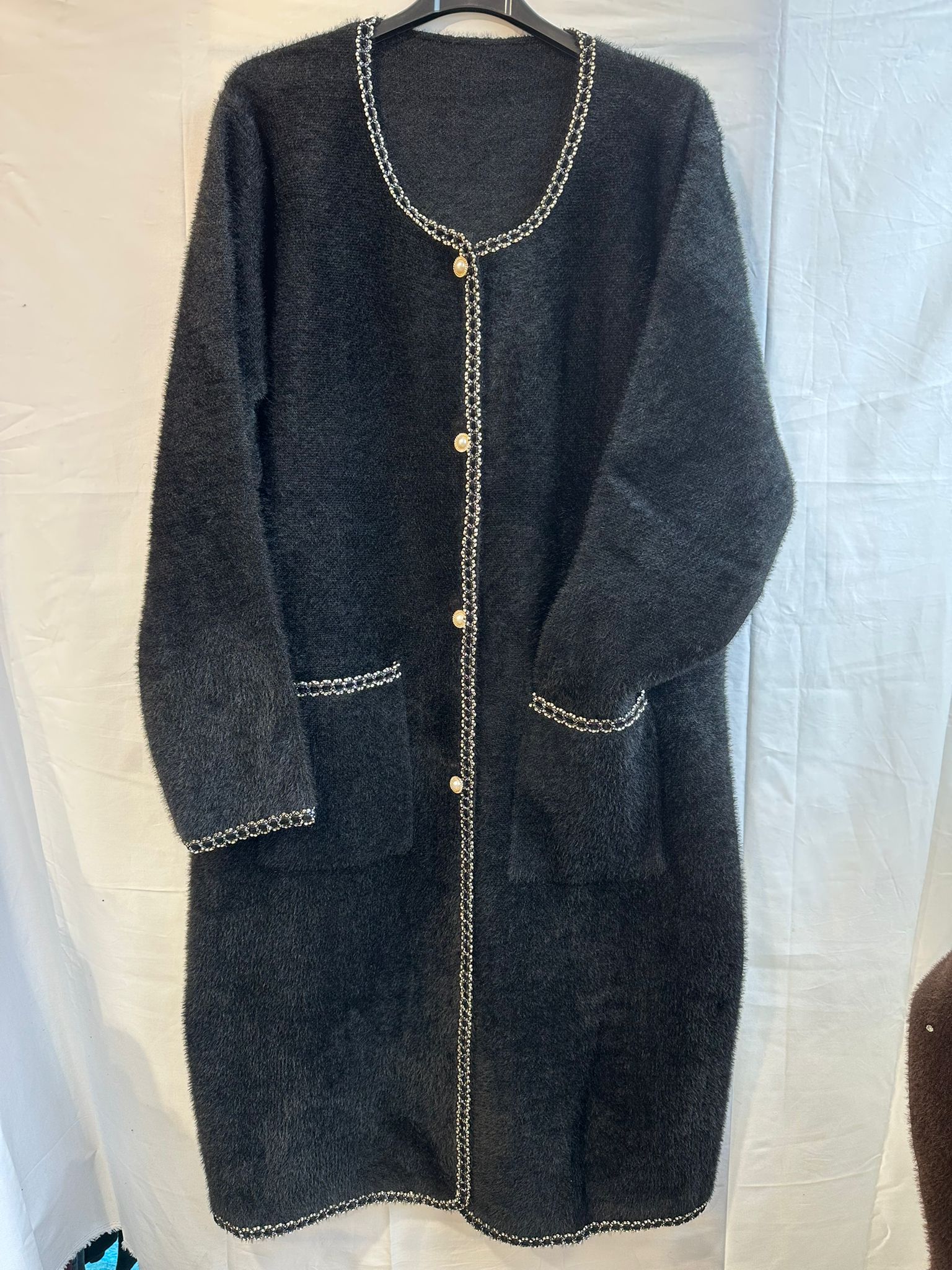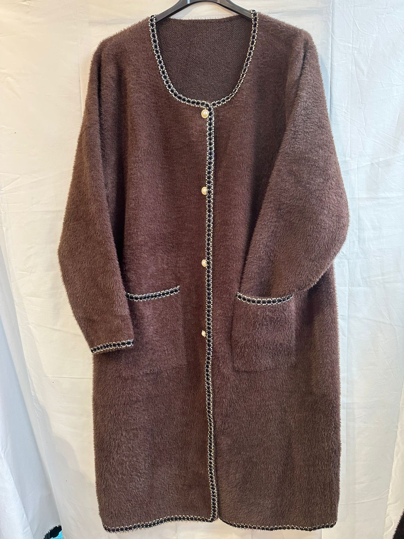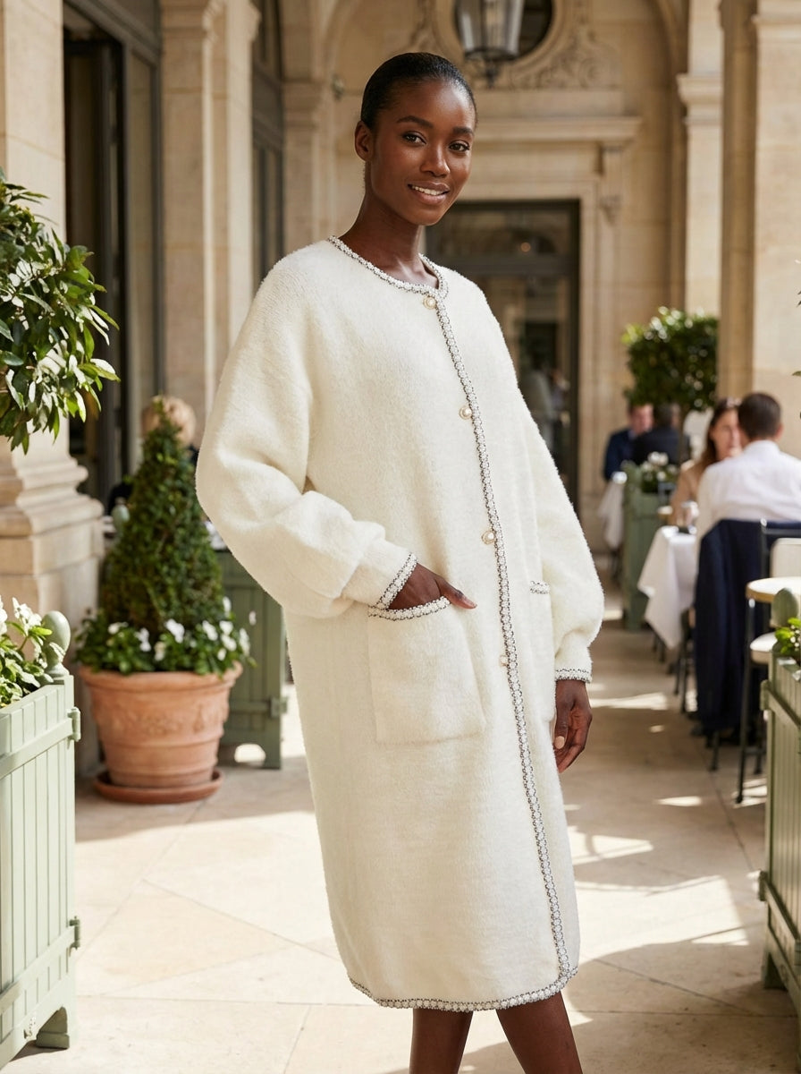 Elevate your winter wardrobe with our Pearl & Chain Trim Longline Cardigan crafted for those who want warmth without compromising elegance. Designed in a plush, soft-touch knit, this coat blends comfort and sophistication with its statement pearl-and-chain trim detailing.