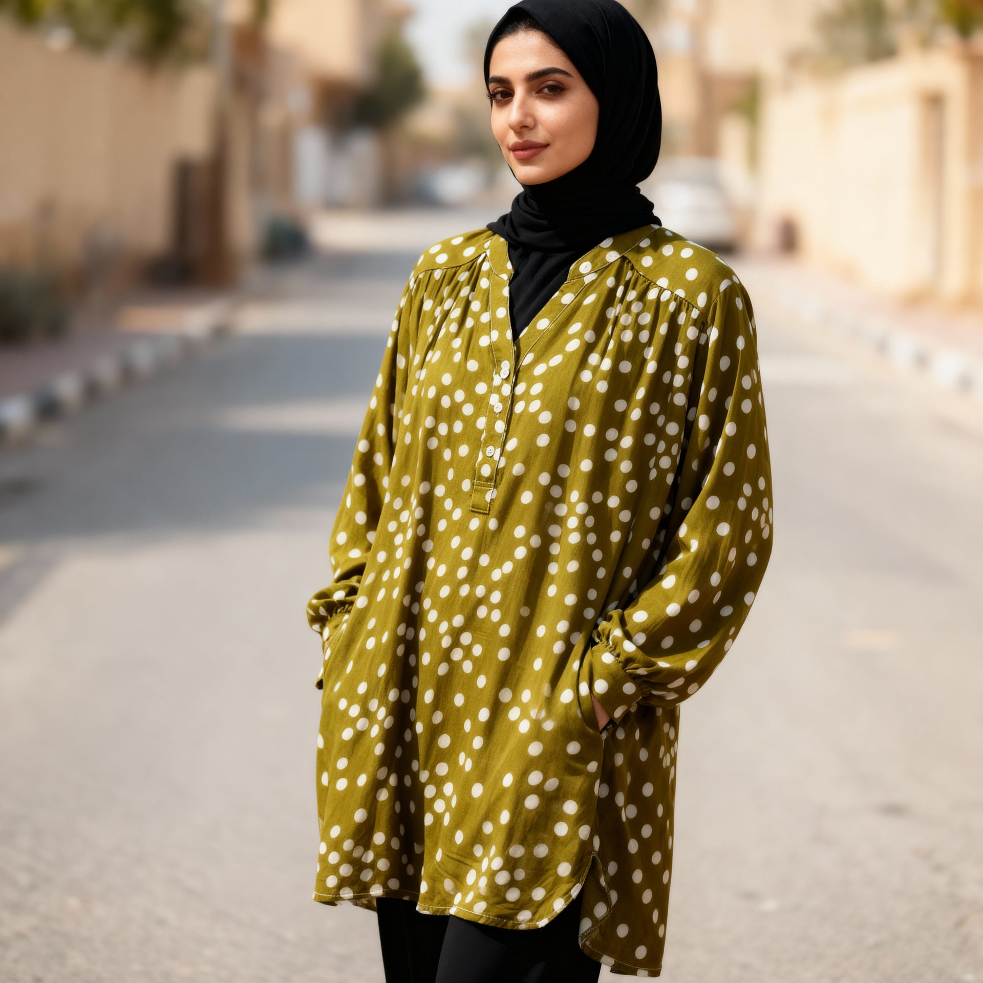 A versatile piece that pairs beautifully with trousers, jeans, or modest layering for an effortlessly chic look.